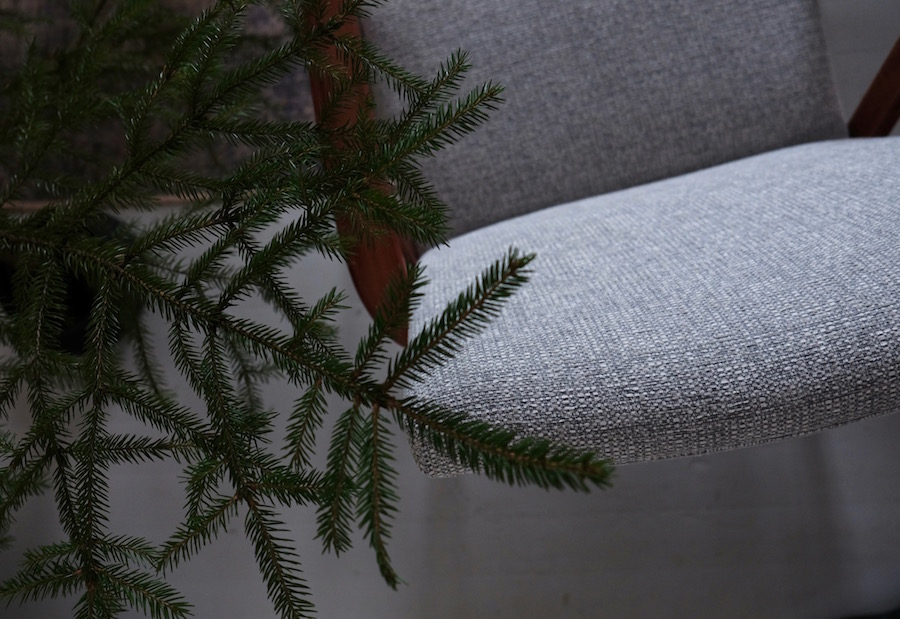 Nyt keskikesällä päästään rekvisiitaltaan jouluaiheisen tuolipostauksen pariin. Nämä 50-luvun tuolikaunokaiset valmistuivatkin viime jouluksi, mutta ovat päässeet täältä blogista unohtumaan. Tuolien pehmusteet uusittiin ja vaaleanharmaa eläväpintainen Lauritzonin kangas sopii kauniisti yhteen puuosien kanssa.
